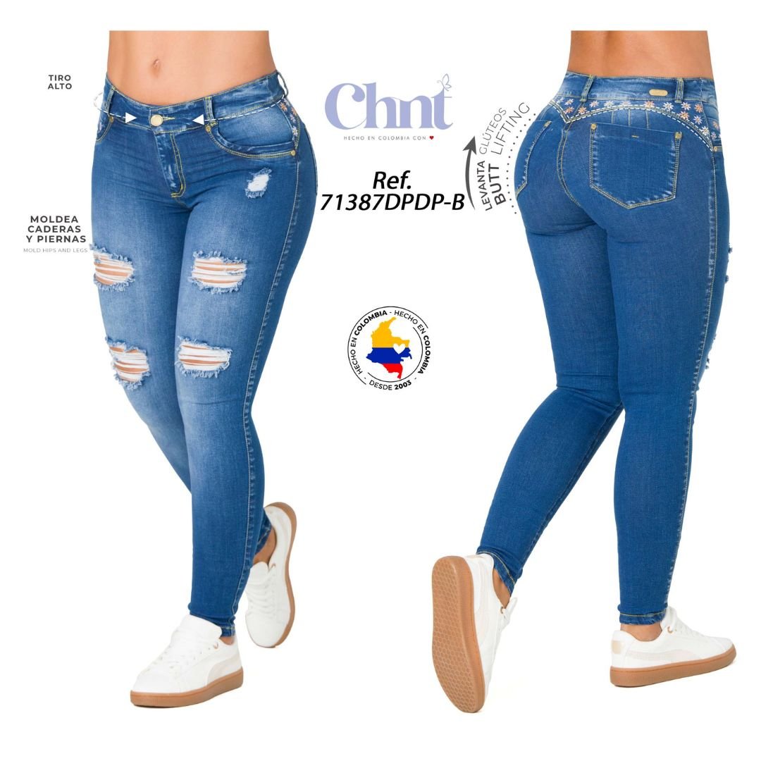 PROCESO Con Rotos TERMINACION DE BOTA Skinny ESTILO Moda PRETINA Delgada COMPOSICION 98% Algodon – 2% Spandex Con Bolsillo Posterior AJUSTE DELANTERO Cintura Alta Con 1 Botón y Cierre COLOR MEDIUM BLUE TALLA CHNT